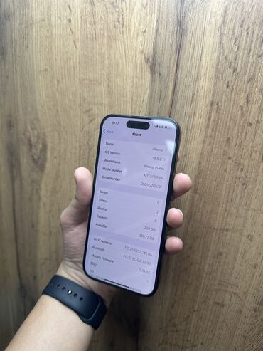 IPhone 15 Pro, титановый корпус. Характеристики: - Память: 512 ГБ (доступно около 496,9 ГБ) - iOS: 18.6.2 - Модель: MTV93KN/A (серийный номер на фото) - Аккумулятор: максимальная ёмкость 87%, сост...