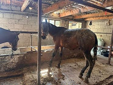 Лошадь темной масти (вороная/темно-гнедая), в стойловом содержании. - Пол: кобыла (визуально определяется по корпусу и морде; на фото — в недоуздке). - Возраст: ориентировочно молодой/средний (по...