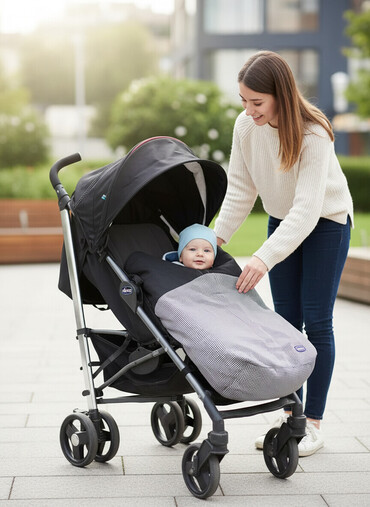 Комплектации имеется тёплый зимний кокон (спальный мешок)и для дождливый погоде дождевик