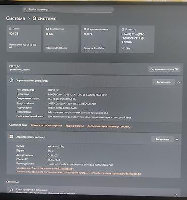 Продаю компьютер, решил продать потому что нужны деньги. По конфигурации тут стоит: Intel Core i3-10100F 3.60GHz, 16 Гб ОЗУ DDR4 на частоте 2666 2x8, видеокарта Sapphire RX 580 8GB, материнская плата Asus h510m-k, башня Deepcool Gammax 300 red, SSD на 128 Гб, HDD на 500 Гб,блок питания на 600w от Be Quiet!, корпус Aerocool Zauron. На фото память 809 Гб из за моего третьего диска, его я не продаю. Продаю только системный блок, не большой торг.