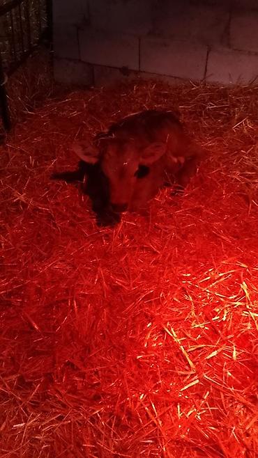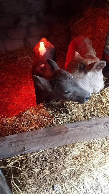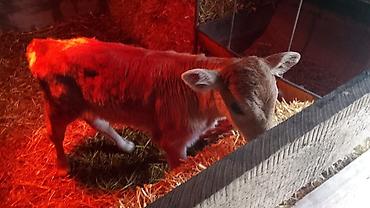 Телята, выращенные на подстилке из соломы в тёплом стойле с инфракрасными лампами обогрева. На фото — молодые телята разной масти (серо‑бурые и рыжие с белыми отметинами), содержатся в индивидуальных загонах с доступом к сену и поилкам.