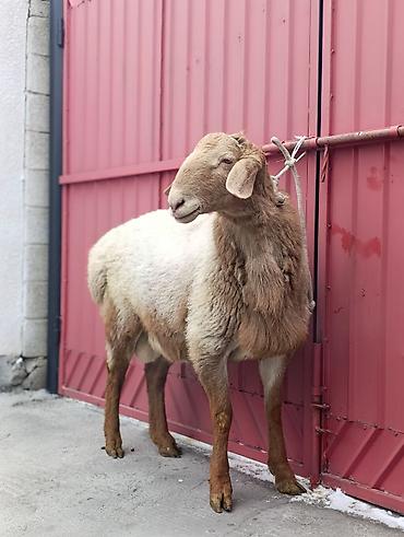 Овца мясо‑шерстного направления (фото из загона) - Порода: помесная, мясной тип, крупное телосложение. - Пол: ярка/овцематка (по экстерьеру — самка). - Окрас: светло‑рыжий/палевый, однородный. - Ш...