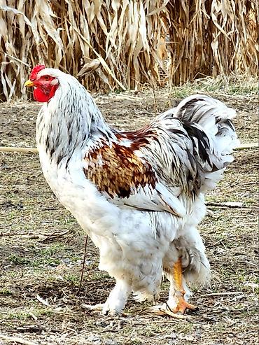 Брама петухи. Описание: - Порода Брама, светлый окрас (белое оперение с чёрной окантовкой на гриве, крыльях и хвосте) - Крупные, мощные петухи с пышным оперением на лапах - Спокойный, уравновешенн...