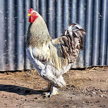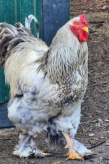 Крупный декоративно-мясной петух породы брама. Описание: - Окрас: светлый (белый) с контрастным темно-серым/черным оформлением гривы и хвоста. - Выраженный гребень и сережки ярко-красного цвета. -...