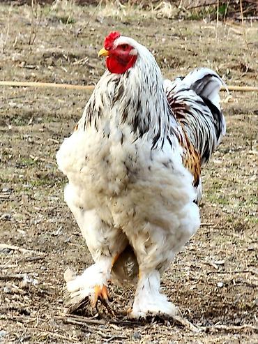 Петух породы, брама (с пышным оперением на ногах и крупным корпусом). Окраска светлая: белое тело с темными (серо‑черными) краями перьев на крыльях и хвосте, гребень листовидный, мочки красные. Ха...