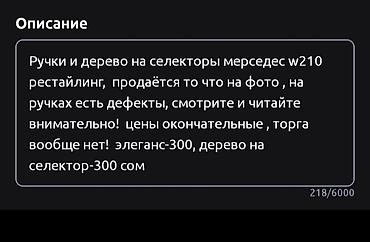 Продаю ручку Элеганс и дерево на кулису мерседес w210 рестайлинг. на ручке присутствует дефект цена 300 сом, без торга.