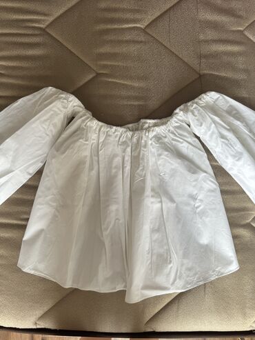 Белый топ-корсет в стиле молочницы с короткими рукавами и квадратным вырезом. Изделие украшено сборками на груди и шнуровкой спереди, что позволяет регулировать посадку. Нижний край отделан кружево...