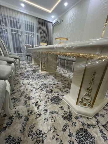 Стол 4 метра , 12 стульев материал карагач . Покупали в Альянс мебель