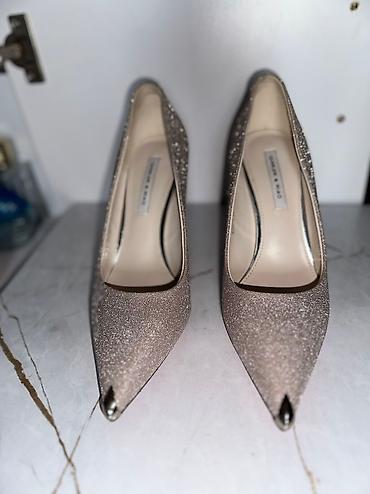 Женские туфли-лодочки с открытой пяткой и ремешком - Модель: лодочки с острым носком, открытая пятка, тонкий ремешок вокруг щиколотки с металлической пряжкой. - Цвет: шампань/светло-золотистый. - ...
