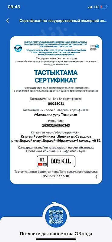 - Регион: 01 (г. Бишкек).