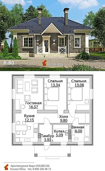 - Планировочная идея: компактный одноэтажный/мансардный дом с рациональным зонированием. На референс-плане — 2 спальни, гостиная, отдельная кухня, холл, тамбур, котельная/техпомещение, просторная ванная. Возможна адаптация под 3 спальни.