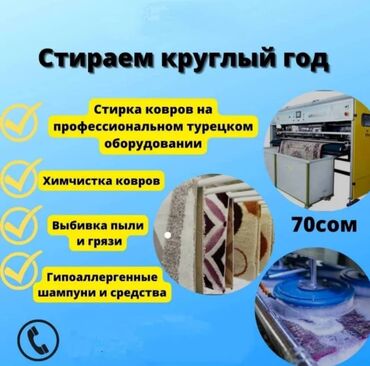 Услуги по профессиональной чистке ковров и других текстильных изделий. Используется специализированное турецкое оборудование и гипоаллергенные шампуни. Производится глубокая выбивка пыли и грязи, а также химчистка. Услуги доступны круглый год. Предусмотрен бесплатный вывоз и доставка при заказе от 15 м². Стоимость чистки составляет 80 сомов за квадратный метр. Предлагается услуга по стирке ковров. В стоимость услуги включены бесплатный вывоз и доставка ковров, что обеспечивает удобство для клиентов. Для чистки используется специализированное оборудование, что гарантирует качественный результат. Данная услуга подходит для тех, кто ищет профессиональный уход за коврами с минимальными хлопотами.