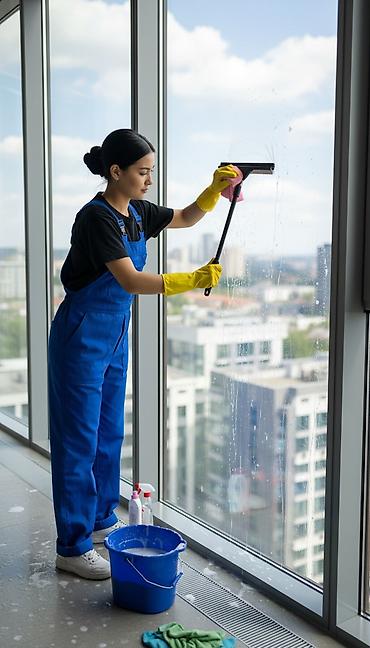 - Бережные моющие средства и чистая вода, сквиджи, телескопические штанги, скребки, микрофибра.