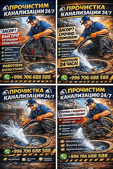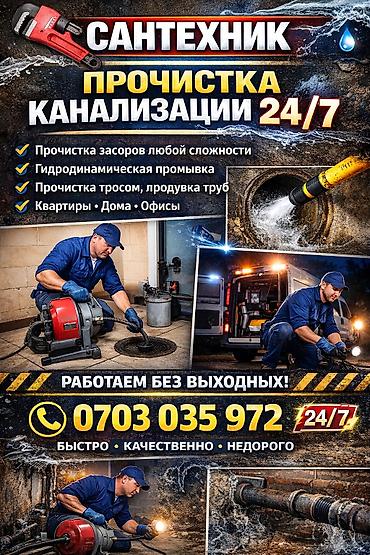 ПРОЧИСТКА КАНАЛИЗАЦИИ 24/7 Профессиональная прочистка и устранение засоров: - Канализационные стояки, внутренние и наружные сети - Раковины, сифоны, ванны, душевые, унитазы - Дренажные и ливневые ...