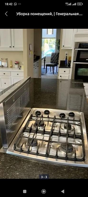 - Генеральная уборка кухни: удаление жира и нагара с варочных поверхностей и решеток, чистка духовок, вытяжек и фартуков, обезжиривание фасадов и ручек, мытье столешниц и сантехники.