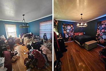 - Наведение порядка и расхламление: разбор вещей, аккуратная организация пространства, обеспыливание мебели и текстиля, придание комнатам опрятного вида «до и после».