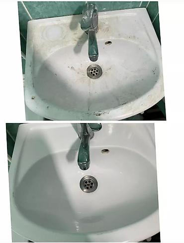 - Глубокая очистка санузлов: раковины, смесители, плитка, швы — удаление налёта, известковых и ржавых пятен, мыльных разводов до блеска (пример “до/после” на фото).