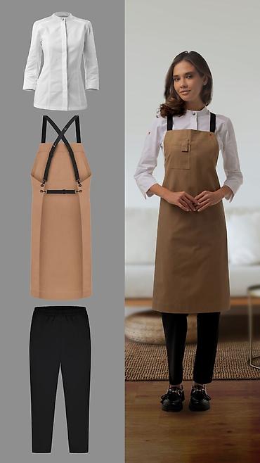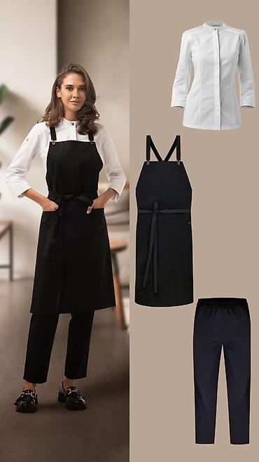 - Комплекты: китель/рубашка с воротником-стойкой, фартук на регулируемых лямках, прямые брюки.