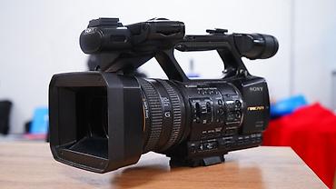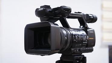 Видеокамера Sony с внешним направленным микрофоном на штативе. Особенности: - Полупрофессиональная видеокамера форм‑фактора handy/pro shoulder с верхней ручкой для удобной съемки. - На корпусе мар...