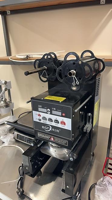 - Полуавтоматическая термоплёнка-машина для запайки стаканов BST: подающие катушки для рулона, электронная настройка температуры и счётчик циклов, кнопки старт/стоп/пауза, направляющие для стаканов.