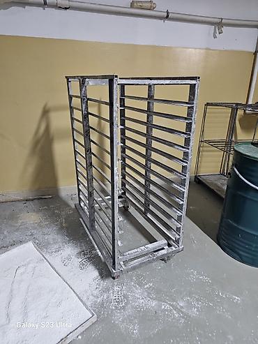 - Пекарская тележка на колесах под противни: двухсторонняя, множество направляющих для удобной загрузки и охлаждения изделий.