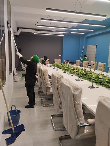 - Офисный клининг: уборка переговорных и рабочих зон, дезинфекция поверхностей, чистка стеклянных перегородок и светильников.
