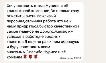 Делаем уборку дома, офиса и после ремонта в Бишкеке. ✅ Генеральная и ежедневная уборка ✅ Мытьё окон ✅ Химчистка мебели и ковров ✅ Уборка перед сдачей/после аренды 📞Свяжитесь с нами—...