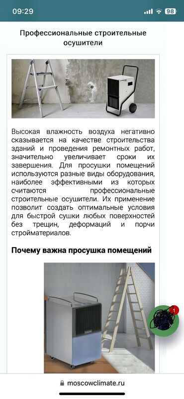 Профессиональные осушители ! Продажа ! Аренда ! Аренда ! Аренда ! Аренда ! Аренда ! Сфера применения осушителя воздуха —Строительство ,затопленные здания квартиры , дома , испозуеться после проведении строительных работ Правильная технология предполагает осушение комнаты или всего здания на каждом из этапов. Сначала проводится нормализация влажности после «мокрых работ» - заливки бетоном, шпатлевки и штукатурки, что поможет их более быстрому высыханию. После этого на уже сухие поверхности клеятся обои, укладываются гипсокартон и напольное покрытие, производится побелка и покраска.