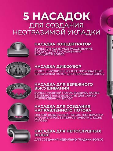 ✅ 5 насадок: диффузор, насадки для бережного высушивания, для непослушных волос и концентратор