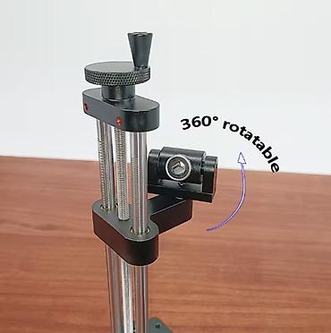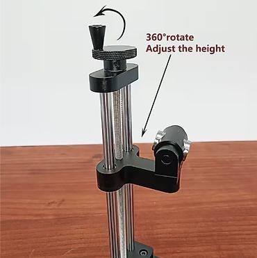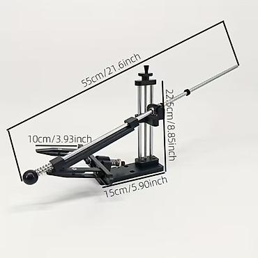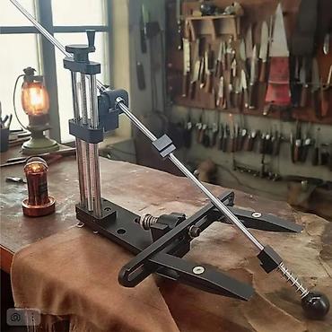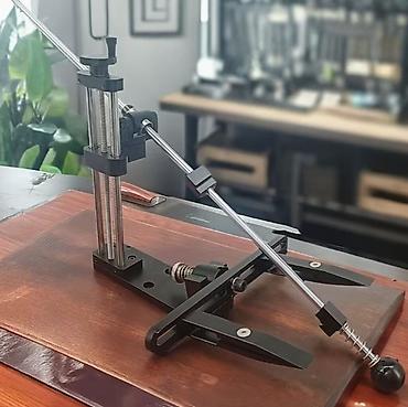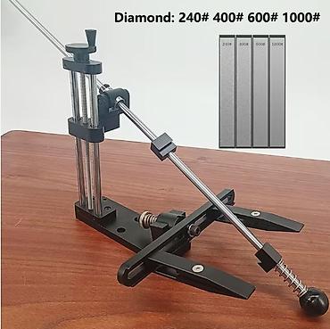 Регулируемый и с механизмом поворота на 360°. В комплекте алмазные бруски разной гритности. Размеры точильных брусков составляют 150x20x5мм. Рукоять может вмещать бруски длинной 150мм, ширину от 8 до 30мм и толщину от 4 до 8мм. Угол заточки регулируется от 15 до 45°.