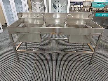 - Двухпостовая моечная станция/раковина из нержавеющей стали с двумя глубокими мойками, центральной перфорированной зоной стекания и двумя смесителями — для предварительной/финишной обработки и промывки.