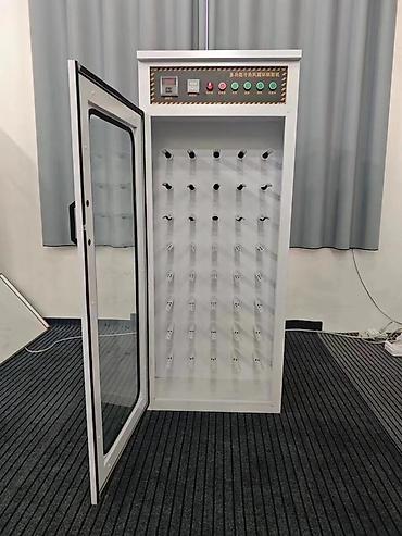 - Шкаф-сушилка для обуви с фронтальной стеклянной дверью. Внутри — многоуровневые воздуховоды/штифты для размещения пар обуви; панель управления с цифровыми индикаторами и кнопками: регулировка температуры, времени, включение нагрева и обдува. Предназначен для быстрой и равномерной сушки кроссовок, ботинок и другой обуви изнутри.
