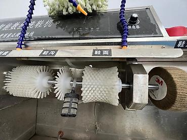 - Машина для мойки/чистки обуви из нержавеющей стали с набором сменных щёток разной жёсткости и форм: для подошвы, канавок/протектора и верха обуви, а также полировальный круг. Имеет подачу воды через гибкие подводы, защитный кожух и рабочую ванну для отвода грязи.