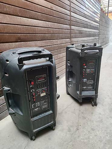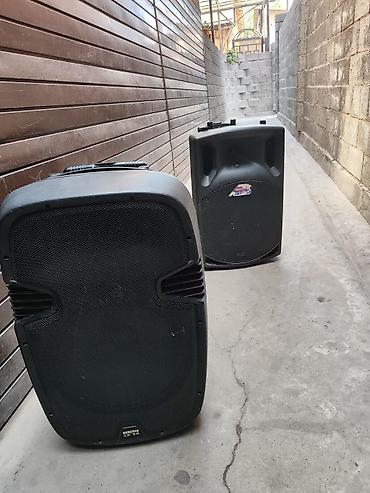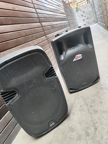 - Две активные напольные акустические системы в пластиковых корпусах на колесиках, с ручками для переноски. Тыловая панель каждой колонки: встроенный микшер/усилитель, регуляторы тембра и уровня, входы/выходы XLR, Jack 6,3 мм и RCA, коммутационные переключатели, разъем питания, клеммы. Фронт — защитная металлическая решетка.