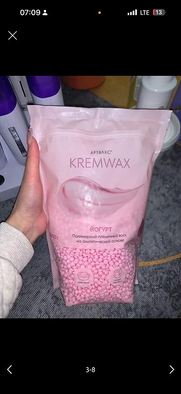 - Полимерный плёночный воск в гранулах Артвакс KremWax «Йогурт», 1000 г (синтетическая основа, крем-воск, гипоаллергенно — указано на упаковке).