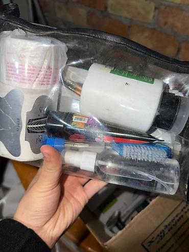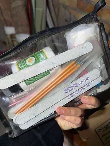- Косметичка с инструментами и расходниками: пилки 100/180 (несколько штук), кисти, апельсиновые палочки/шпатели, баночки с уходовыми средствами и прочие аксессуары для работы.