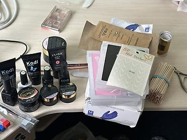 - Расходники: безворсовые салфетки, бафы и пилки, апельсиновые палочки, формы для наращивания, щёточка, перчатки нитриловые (M).