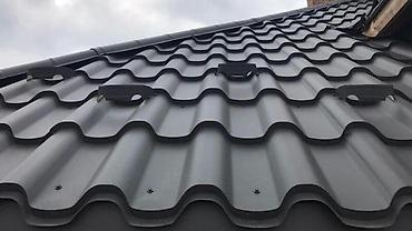 Металлочерепица темно-серого цвета. Имеет профиль, имитирующий натуральную черепицу, что придает кровле эстетичный вид. Подходит для использования в различных климатических условиях.
