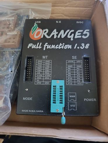 - Универсальный программатор микросхем Orange5 (интерфейс USB, питание 5 VDC), «Full function 1.38». На корпусе нанесены распиновки разъёмов MT и SE, ZIF‑панель для микросхем.