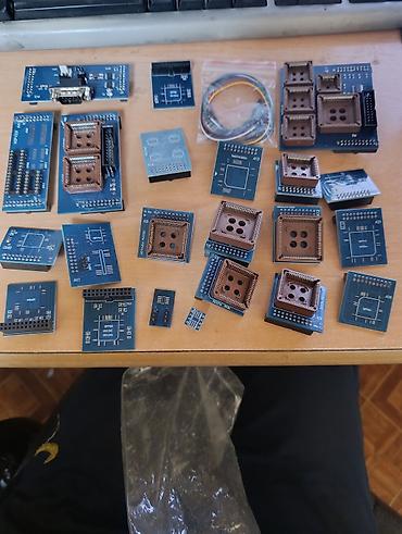 - Набор печатных плат‑адаптеров под различные корпуса микросхем (в т.ч. с ZIF‑сокетами, переходники под SOP/SSOP/TSSOP/QFP и др.; маркировки на платах A1–A21, M8LP, QFPxx, 95xxx/25xxx и пр.).