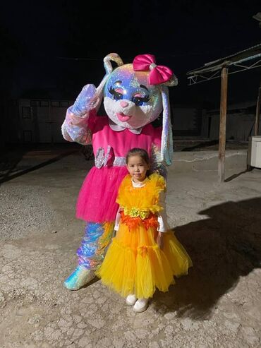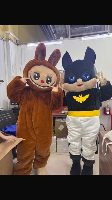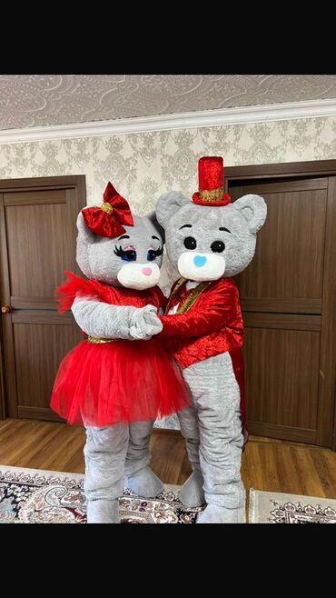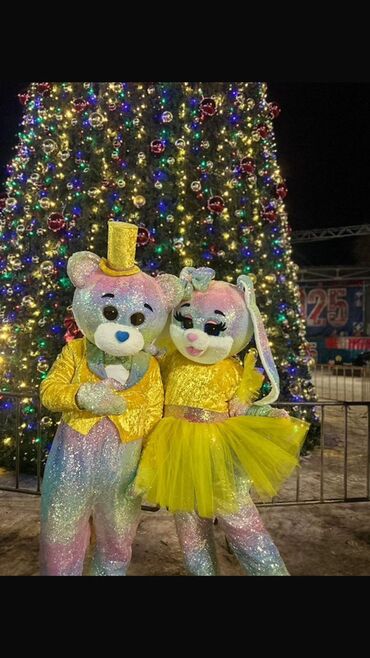 - Яркие ростовые куклы: мишки и зайка в блестящих костюмах (варианты с жёлтыми, розовыми и красными нарядами), парные образы для фотосессий и интерактива.