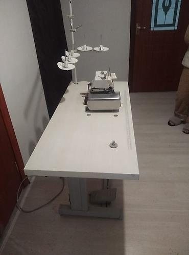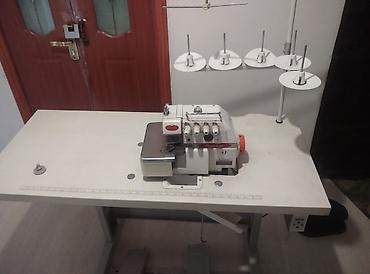 - Тип: промышленный оверлок, 5-ниточный (видны 5 держателей катушек), с комплексной установкой на столе.