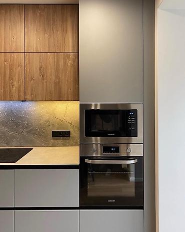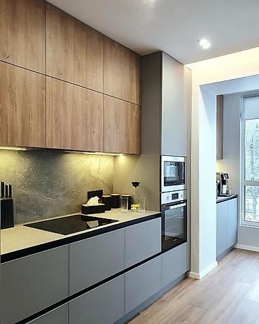 Благодаря угловой планировке удалось максимально эффективно использовать пространство, создав удобные рабочие зоны. Тёмно-серый цвет добавляет кухне современный вид, а деревянные элементы придают ей теплоту и уют.