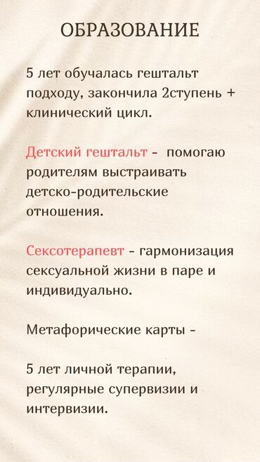 Психолог. С этим можно разобраться Если внутри тревожно, в отношениях тяжело, а тело живёт в постоянном напряжении — вы не «сломаны». С этим действительно работают. Я — психолог. Помогаю людям...