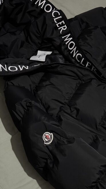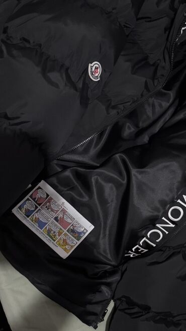 - Брендинг: крупная вышитая надпись MONCLER по кромке капюшона, фирменный шеврон-логотип на рукаве, внутренняя комикс-вставка