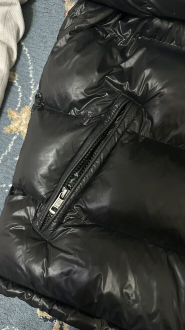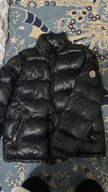 Пуховик Moncler, черный, классическая лаконичная модель с глянцевым нейлоновым верхом.