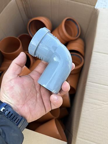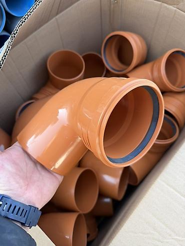- Фитинги: повороты/отводы 90° и другие элементы, серые (для внутренней канализации) и оранжевые (для наружной). На раструбах установлены резиновые манжеты для герметичного соединения без клея.