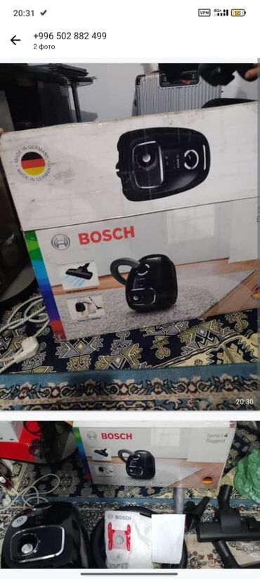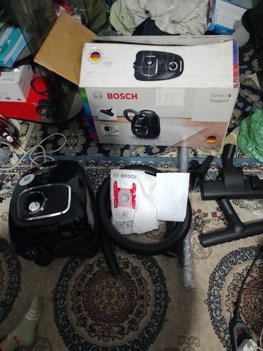 - В комплекте: корпус пылесоса, гофрошланг, телескопическая трубка, напольная насадка, пылесборный мешок Bosch, фильтр/салфетка (по фото), оригинальная коробка