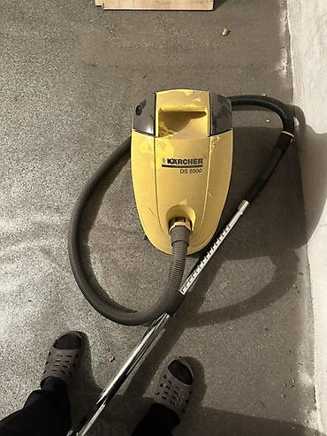 Пылесос Karcher DS 5500 в желтом корпусе с черными и серыми элемент. Оснащен гибким шлангом и телескопической трубкой. Модель предназначена для сухой уборки и обеспечивает эффективное удаление пыли и мусора с различных поверхностей. (Слабо сосет, необходимо поменять фильтры, двигатель рабочий).