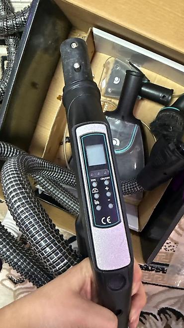 - Электронная рукоятка управления с дисплеем: кнопки ON/OFF, регулировка мощности (+/–), режим ION (ионизация), индикаторы и кнопка с каплей для влажных режимов/распыления.